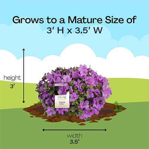 The Autumn Lilac Encore Azalea reaches 3′ H and 3.5′ W, making it a great choice for a low-maintenance hedge or border.