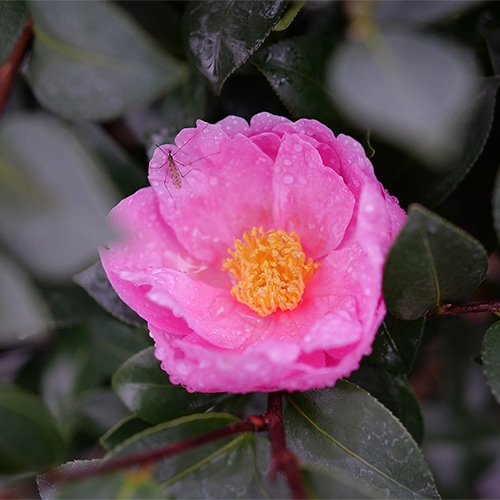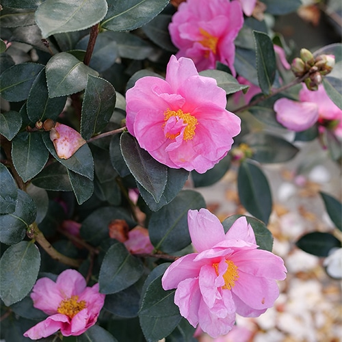 The abundant and colorful blooms of the Just Chill camellia series light up the fall garden! Especially gardens with a bit more chill in the air, as these beauties were selected for their improved cold hardiness. The thick evergreen foliage adds drama and good texture to the garden year-round, making these moderately large shrubs good for the middle of the border and perfect as hedging. Just Chill™ Double Mauve camellia has mauve-pink flowers, easily popping in the fall garden.