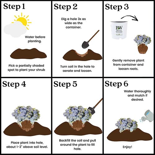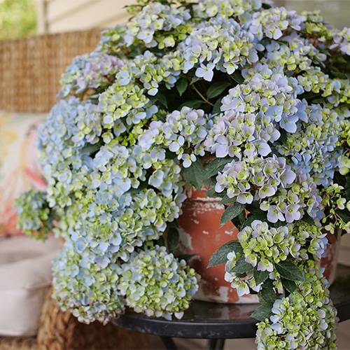 Fairytrail Fresco Cascade Hydrangea® is an early-blooming variety with unique, trailing stems and colorful mophead flowers (blue or pink depending on soil). Its compact, cloud-like appearance makes it perfect for containers, hanging baskets, and front-of-border planting.