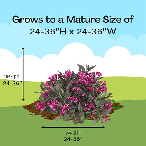 Spilled Wine weigela shares the fabulous deep purple foliage and bright pink flowers of the classic Wine & Roses weigela but in a smaller size. This useful plant grows wider than tall, making it the perfect choice for edging beds or walkways and for incorporating under windows in your landscaping. Like all weigela, it is deer resistant and very easy to care for.