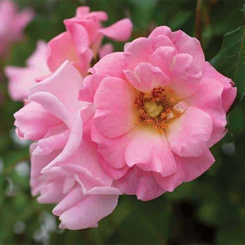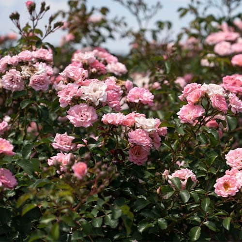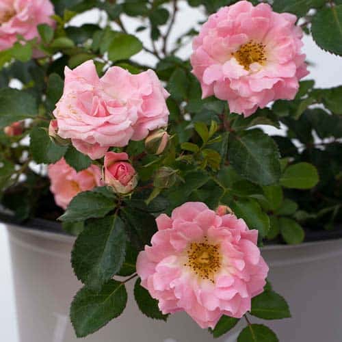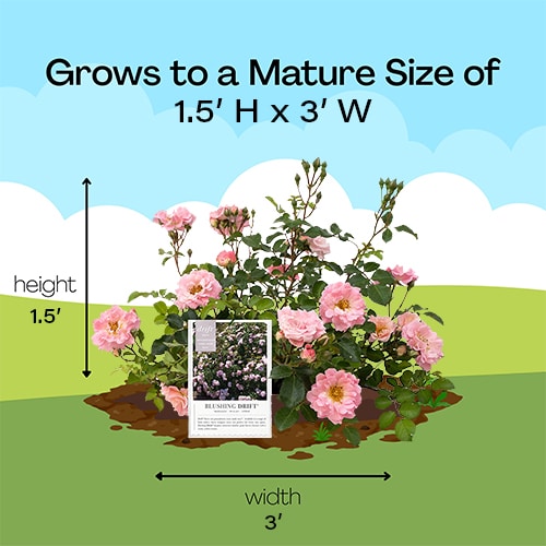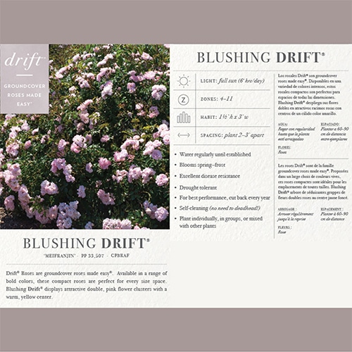 Drift Roses are a cross between full-size groundcover roses and miniature roses. The low, manageable habit of Drift Roses makes them perfect for gardens small to large, for planters, and for mass commercial plantings. They brighten up borders, fill in empty spaces, meander around established plants, and can control erosion on hillsides and slopes. This continuous bloomer flowers all season and pairs effortlessly with other plants. The Blushing Drift double soft pink flowers with yellow centers prove to be an elegant addition to any garden, especially when able to naturally drape over a rock wall or edge.